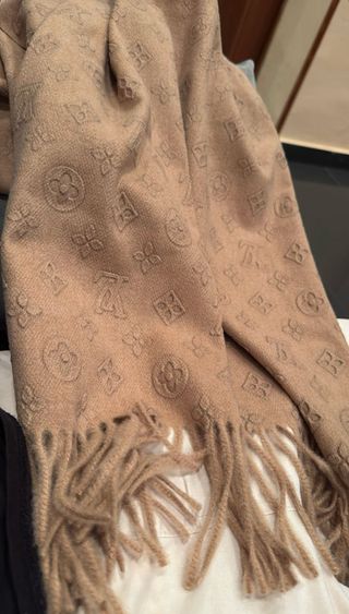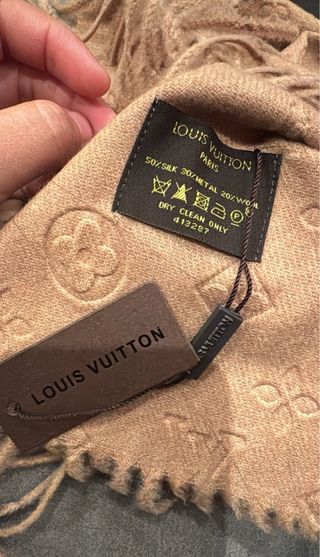 Bufanda de Louis Vuitton con un diseño elegante. - Composición: 50% Seda, 30% Metal, 20% Lana. - Instrucciones de cuidado: Limpieza en seco únicamente. - Código de producto: 413287.
