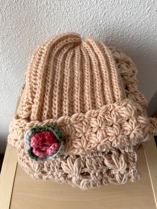 Conjunto de gorro y bufanda de lana, ideal para mantenerse abrigado. El gorro tiene un detalle de flor tejida. - Material: Lana - Diseño: Gorro con flor y bufanda a juego