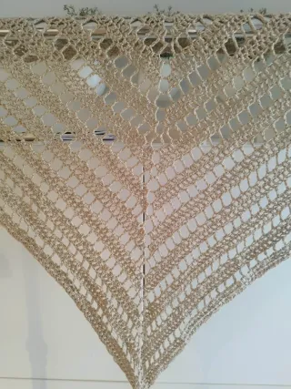 Elegante chal triangular hecho a mano con lana fina e hilo brillante. Su diseño intrincado y los flecos le dan un toque especial. - Material: Lana fina e hilo brillante. - Diseño: Tejido a mano con patrón de red y flecos. - Color: Beige y dorado.