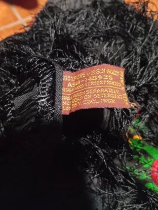 Espectacular mantón de colección en estado impecable. Pieza de alta calidad fabricada en Japón, nada que ver con imitaciones sintéticas actuales. Material: 100% Pure Virgin Wool (Lana Virgen), cálida y de caída elegante. Técnica: Hand Screen Printed. Estampado artesanal con colores vibrantes. Diseño: Clásico floral sobre fondo negro con enrejado de macramé y flecos largos. Estado: Excelente conservación, sin roces ni desgarros. Ideal para eventos, flamenca o coleccionistas de textil vintage. ¡Una joya atemporal!