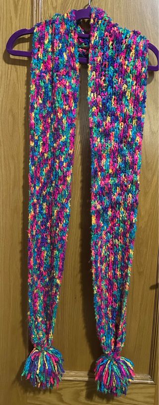 Bufanda larga de lana con un diseño vibrante y alegre. Perfecta para añadir un toque de color a tu atuendo. - Tejido suave y cálido. - Adornada con pompones en los extremos. - Textura única y llamativa.