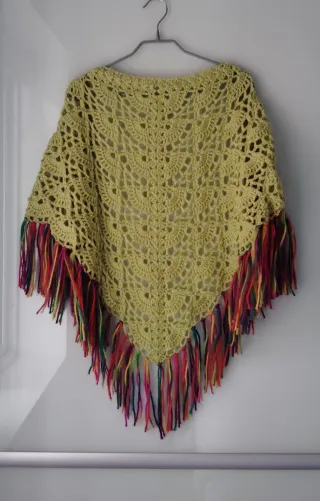 Chal de lana verde pustacho tejido a mano con un diseño intrincado y flecos vibrantes. Precio no negociable. - Material: Lana - Diseño: Tejido calado - Adorno: Flecos multicolor