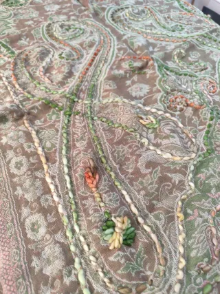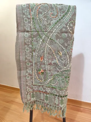 Precioso chal auténtico de Cachemira (India), hecho a mano en lana pura. Tiene bordado artesanal y detalles de cuentas en tonos naturales verdes y beige. Es ligero pero muy cálido — perfecto para otoño e invierno. Ideal como: • Chal elegante • Foulard grande • Accesorio boho • Regalo especial Pieza única, no es producción industrial. Medidas: 180 x 71 cms Entrega en mano o envío.