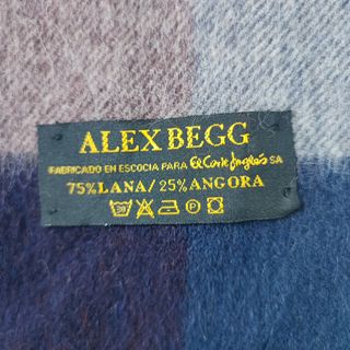 Alex Begg/ Bufanda escocesa de lana y angora. Terminación de flecos en ambos extremos. Tartán en colores azul, burdeos, marrones. Composición: 70% lana, 30% angora. Formato: 30,5 cm de ancho x 180 cm de longitud (sin contar los flecos) En excelente estado, hecha en Escocia.