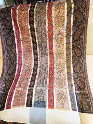 Precioso chal artesanal de lana pura (boiled wool), hecho a mano en Cachemira (India). Pieza única con bordados tradicionales estilo paisley y flecos. Es muy cálido, suave y ligero, ideal para usar como chal, bufanda grande o foulard en invierno y entretiempo. 🎨 Colores muy bonitos en turquesa, rosa, morado y verde. Características: • 100% lana pura • Hecho a mano • Bordado artesanal • Diseño étnico / boho • Flecos decorativos • Pieza única Medidas: 180x71cms aprox Perfecto para personas que buscan ropa boho, estilo étnico, prendas artesanales o textiles de India. Palabras clave: chal lana, bufanda grande, cachemira, boho,