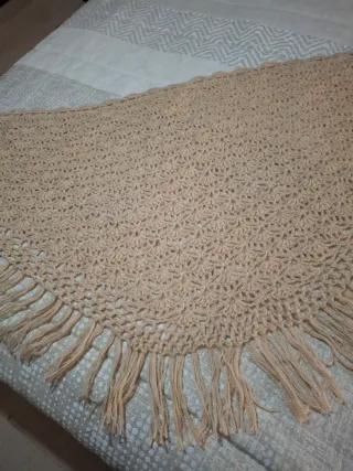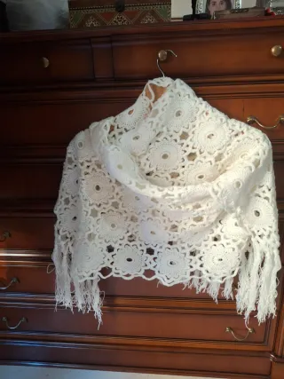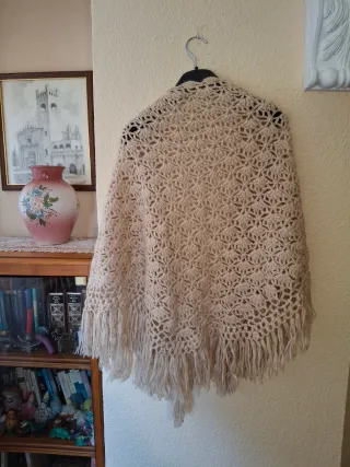 Chal de crochet tejido a mano con un bonito diseño. TAMBIEN para traje regional - Color beige. - Adornado con flecos en el borde. - Medidas en foto Lana de calidad Apenas usado No ofertas ,gracias