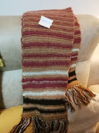Preciosa bufanda en tejido mezcla de lana (30%) y viscosa (70%). Muy suave y amplia. Ancho 51 cm aproximadamente. Largo 192 cm aproximadamente (sin contar los flecos). Nueva sin etiqueta. Fue un regalo nunca se ha usado nunca.
