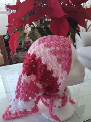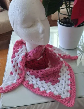 Pico- bufanda de lana en punto granny hecho a mano. - Material: Lana. - Colores: Rosa y blanco. - Diseño: Cuadrados estilo granny square.