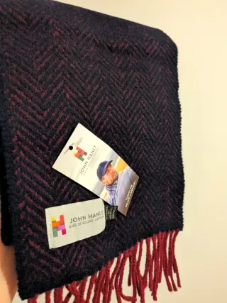 Bufanda de lana merina y cashmere con un diseño de espiga en azul y rojo. - Fabricada en Irlanda. - Diseño de espiga. - Nueva con etiquetas.