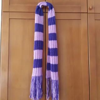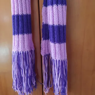 Bufanda de lana tejida a mano con un diseño de rayas vibrantes. Perfecta para añadir un toque de color a tu atuendo. - Diseño de rayas moradas y lilas. - Acabado con flecos en los extremos. - Material suave y cálido.