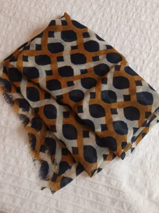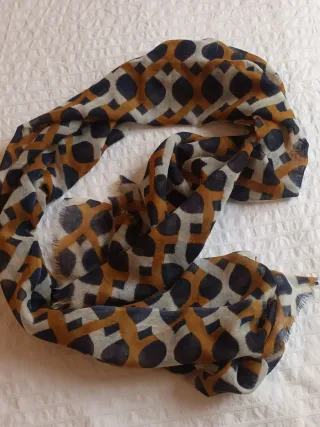 Pañuelo largo de lana con un diseño geométrico y de puntos. - Estampado en tonos marrones y azul marino. - Acabado con flecos en los bordes. - En perfecto estado, usado solo una vez.