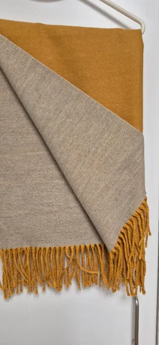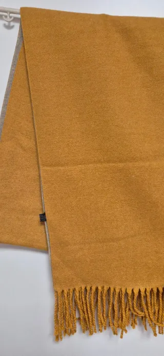 Bufanda reversible 50% lana, 50% viscosa - Un lado en color beige/tostado y el otro anaranjado. - Ancho 70 cm y largo 180 cm más los flecos - Con flecos trenzados en los extremos.