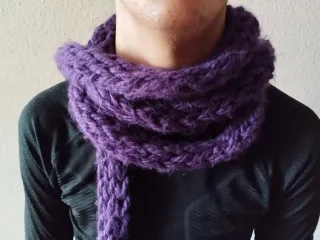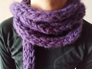 Bufanda fina de lana, tejida con un punto grueso y cálido. Perfecta para complementar tu atuendo. - Material: Pura lana. - Color: Morado o verde aceituna. Longitud de más de 3 metros. Perfecto estado. Tres euros cada unidad.