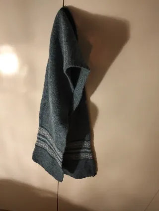Cuello de lana hecho a mano con un bonito diseño.Medidas aproximadamente 23× 40 Dos Vueltas luego se estira al.ponerla Lleva un fino.hilo tipo plata/gris Tejida por mi.a mano .Única de abrigo - Material: Lana. - Color: Azulón.