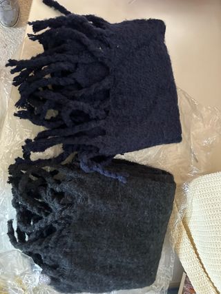 Lote de 4 bufanfas en buen estado:1-Marron con pompones de lana,2-Azul marino CK(el logo se ha troquelado del paso del tiempo)tejido polar,3-Pashmina blanco,4-Bufanda negra con diseño de rallas