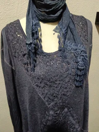 Jersey con bufanda, bonito, original y muy cómodo, es gordito, abriga mucho, tonos en degradé, azulón, marrón y beis, escote redondo, mangas largas y anchas, suave y esponjoso, está en muy buen estado. Las medidas sin estirar son 65 cm de axila a axila y 64 cm de largo el jersey y 30 cm de ancho y 250 cm de largo la bufanda. Hago descuentos si compras varios artículos ☺️.