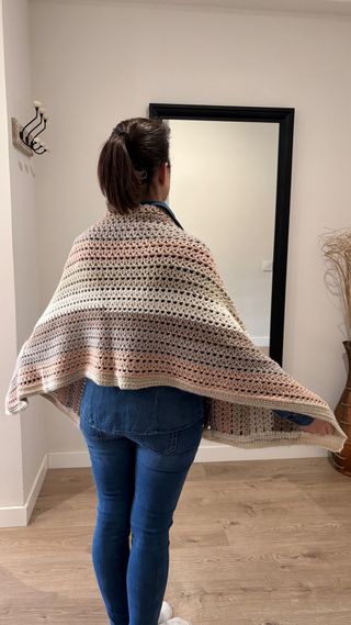 Hecho a mano por mi madre con mucha ilusión. Chal tejido con mangas, ideal para añadir un toque especial a tu atuendo. - Diseño en V. - Tejido con diferentes texturas y patrones. - Mangas amplias.