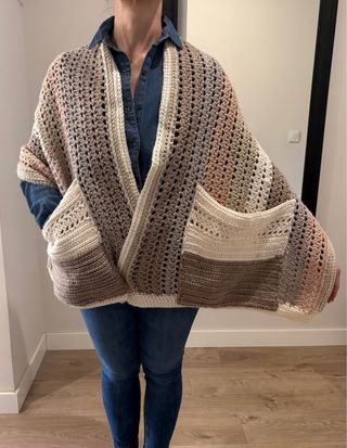 Precioso chal tejido a mano por mi madre, perfecto para añadir un toque de estilo a tu atuendo. - Diseño con mangas y bolsillos. - Tonos beige y rosa que combinan fácilmente. - Tejido ligero y cómodo.