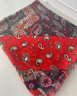 Foulard largo de Mango con un diseño llamativo y vibrante. - Estampado paisley y floral. - Tonos rojos, grises y verdes. - Acabado con flecos.