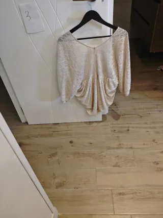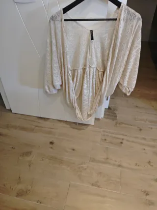 Precioso chal con mangas en un tono beige, perfecto para añadir un toque elegante a tu atuendo. - Tejido ligero y con brillo. - Diseño abierto. - Mangas amplias.