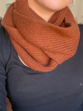 Bufanda de punto suave y cálida, ideal para el invierno. Su diseño en color marrón chocolate la hace muy combinable. - Tejido de punto acanalado. - Estilo circular o infinito Medidas: 1,63 mts largo x 14,5 cm ancho