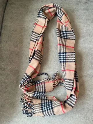 Bufanda de lana suave con flecos. Tiene poco uso pero, aunque ha perdido algo de color (y de ahí el precio) está muy bien conservada. Es corta (102cm)