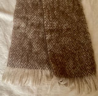 Bufanda de mohair con un diseño de espiga en tonos marrones y beige. Presenta un acabado con flecos en uno de sus extremos. - Tejido suave y cálido. - Diseño clásico de espiga. - Flecos decorativos.