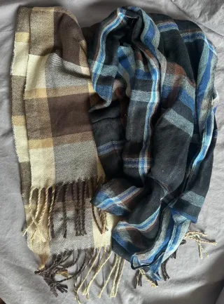 Conjunto de dos bufandas con diseño a cuadros. - Una bufanda presenta cuadros en tonos azules y negros. - La otra bufanda tiene cuadros en tonos marrones y beige. - Ambas bufandas tienen flecos en los extremos.