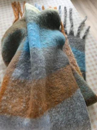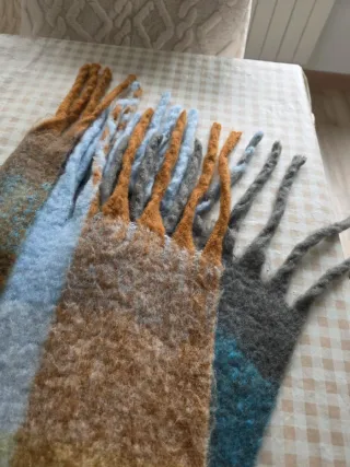 Bufanda de lana con un diseño único y texturizado. Perfecta para añadir un toque cálido y estiloso a tu atuendo. - Material: Lana - Textura: Rizada y con flecos - Diseño: Trenzado y con mechones sueltos De 2.05mx0.35cms.. muy abrigada y confortable.