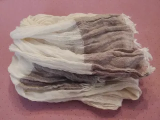 Fular de tela con un diseño degradado de blanco a marrón. Su textura es ligera y arrugada, con flecos en los extremos. - Material: tela - Diseño: degradado - Acabado: flecos