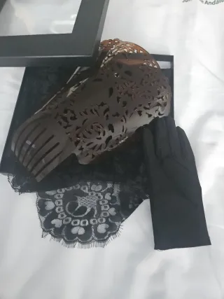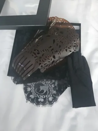 Por liquidación por cierre Conjunto de mantilla de madrina 220x100cm, peineta y guantes. Los precios están rebajados al máximo. NO NEGOCIABLE - Mantilla de encaje negro. - Peineta marrón con diseño calado. - Guantes negros de REGALO
