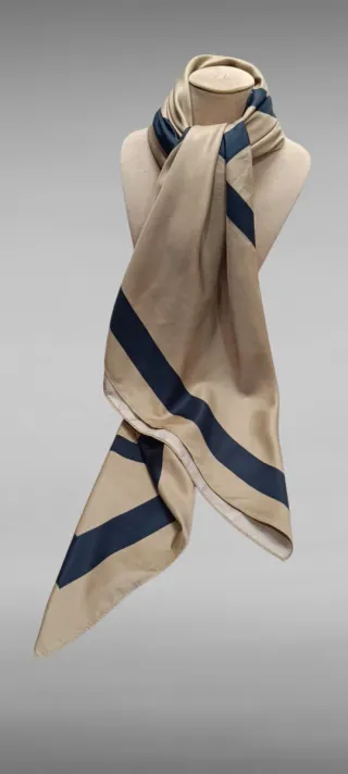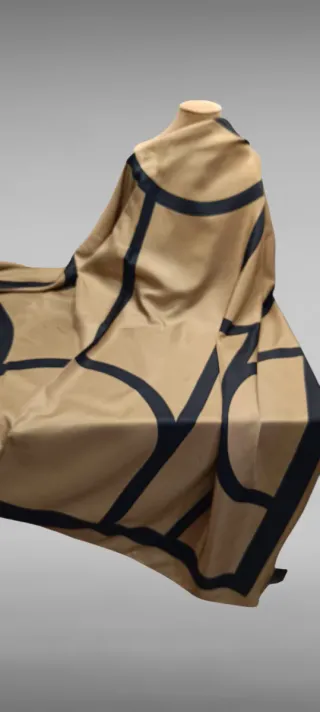 Pañuelo de H&M con un diseño geométrico. Elegante pañuelo de H&M color beige con detalles disele en negro. Tiene pequeño defecto casi inapreciable (foto) . Como nuevo. Medidas 100x100 - Tejido satinado. - Estampado de líneas negras sobre fondo marrón.