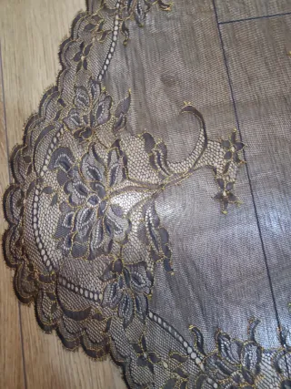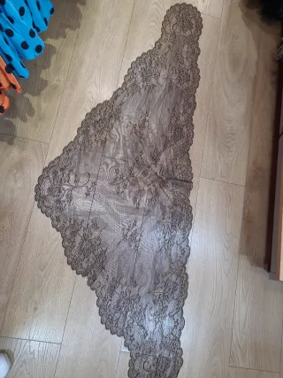 Elegante mantilla triangular con un delicado diseño de encaje. - Medidas: 120 x 60 cm. - Adornos en dorado sobre base marrón.