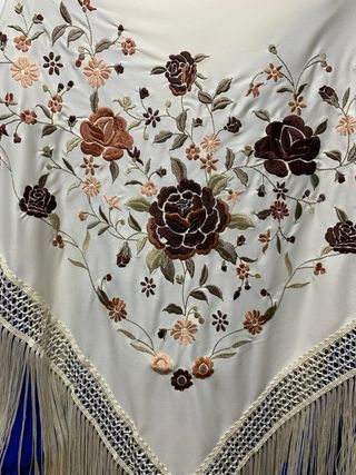 Manton de flamenca crema con un bonito diseño floral bordado y flecos largos. - Medidas: 160x80cm. - Flecos: 25cm.
