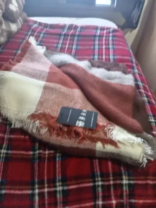 Bufanda con estampado de cuadros en tonos tierra. Suave al tacto.