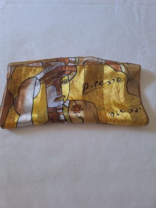 Foulard con un diseño inspirado en Picasso y medidas aproximadas de 134×34 cms. - Foulard en tonos vibrantes amarillos y marrones. - Tejido ligero y sedoso. Presenta algunos "desgastes", más por la fineza del tejido que por el uso. Uno de los extremos está mas redondeado que el otro, que es mas recto. Estos pequeños defectos son prácticamente imperceptibles en el uso.