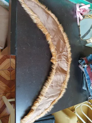 Cuello de pelo para abrigo , trae unas presillas para abrocharlas a los botones. Tiene un tacto muy suave, color es marrón y Camel. Medida 82cm, y 13 de ancho, en la foto se ve las medidas.