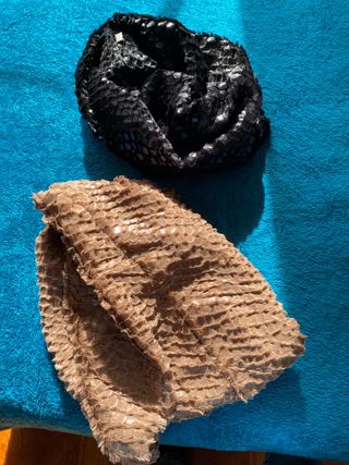 Dos bufandas con un diseño texturizado y brillante. - Bufanda negra con detalles plateados. - Bufanda marrón con acabado suave.