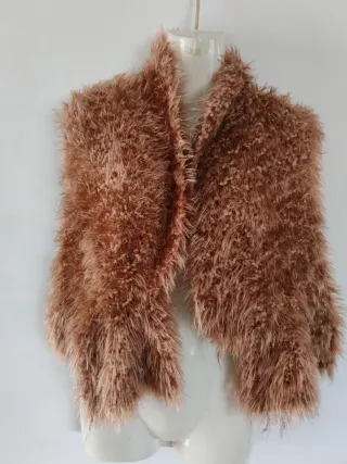 Precioso chal o bufanda de fantasía con un tacto muy suave y peludito. Ideal para dar un toque especial a cualquier conjunto. - Diseño de fantasía. - Textura suave y esponjosa. - Acabado con flecos. Maravilloso cuello, bufanda, chal de invierno. Con forma de cobertor de piel. De punto jaspeado con brillos en tono cobre. Como nuevo.