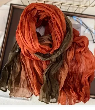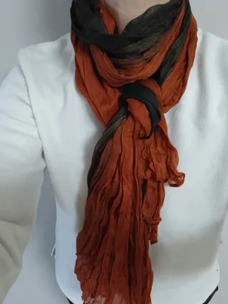 Pañuelo con un diseño degradado y textura arrugada. Colores tierra. Otoñal,boho. - Tejido ligero y vaporoso. - Tonos que van del verde oscuro al naranja vibrante.