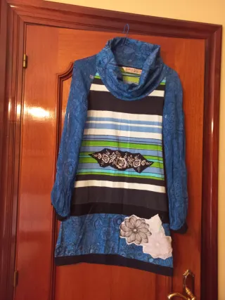 Vestido con un diseño vibrante y llamativo. - Mangas largas de encaje azul. - Cuello alto tipo bufanda. - Cuerpo con estampado de rayas horizontales en varios colores. - Detalle de apliques florales bordados en la parte delantera. - Bajo con estampado floral azul.
