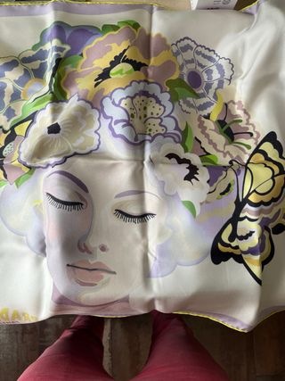 Elegante pañuelo de seda con un diseño artístico de flores y una mariposa. - Estampado multicolor sobre fondo blanco. - Acabado satinado de la seda. - Borde con detalle amarillo.