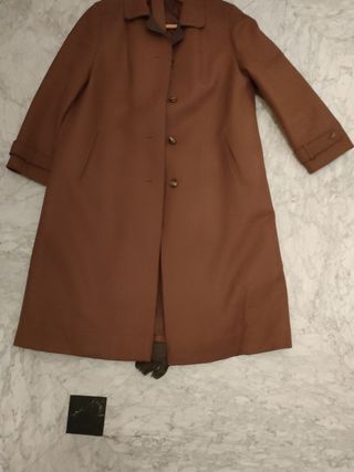 Abrigo Marrón largo con botones , tiene un cinturón y una pequeña bufanda del color de los bordes. Marca karner. se escuchan ofertas