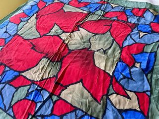 Elegante pañuelo de seda natural italiana para mujer, diseño de Marco Pascali, con un dibujo abstracto y vibrante. - Material: 100% seda natural. - Hecho en Italia - Diseño: Estilo vitral con formas orgánicas en tonos rojos, azules y verdes. - Tacto suave y ligero. - Dimensión aprox.: 83 cm. - Artículo nuevo, sin estrenar.