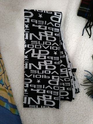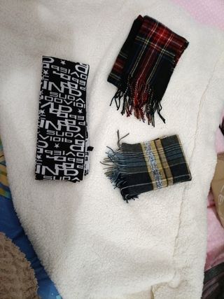 Lote de 4 bufanfas en buen estado:1-Marron con pompones de lana,2-Azul marino CK(el logo se ha troquelado del paso del tiempo)tejido polar,3-Pashmina blanco,4-Bufanda negra con diseño de rallas