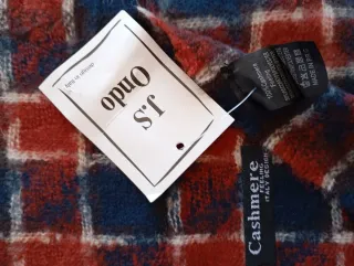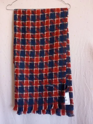 Pañuelo de cuello perfecto tanto para invierno como entretiempo. Muy suave y agradable al tacto. Motivos geométricos en el estampado de colores rojo, ocre y azul. 70% viscosa, 30% lana. Medidas: 65 x 200 cm - NUEVO -