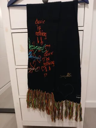Bufanda de la marca Desigual con un diseño llamativo. - Estampado con texto y corazones. - Flecos multicolor en los extremos. - Medidas: 18cm ancho, 185cm largo. 15cm por cada lado de flecos. - Usada pero en buen estado.