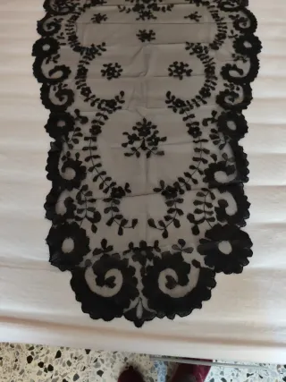 Elegante mantilla de encaje negro. - Diseño delicado con motivos florales. - Borde festoneado con puntilla. - Tacto suave y ligero. 1’74 m x 0’74 cm