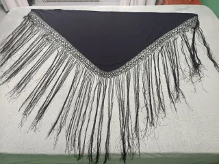Elegante mantón negro con un delicado bordado y flecos largos. - Diseño triangular. - Adornado con un intrincado borde. - Flecos largos y finos. -Esta Nuevo sin estrenar -Las flores son totalmente Bordadas