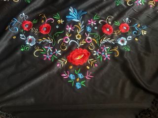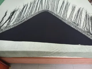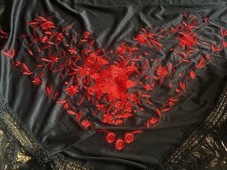 mantilla negra con bordados en rojo medida ancho 1,60cm(hipotenusa)